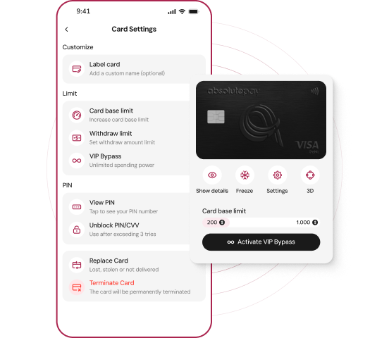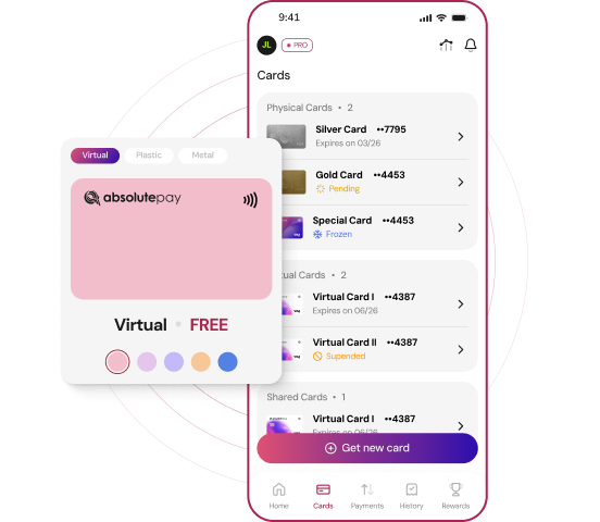 Create, order, and manage both virtual and physical cards directly from your AbsolutePay account. Set and adjust limits, track spending, and configure permissions—all in one secure and convenient platform.