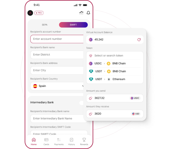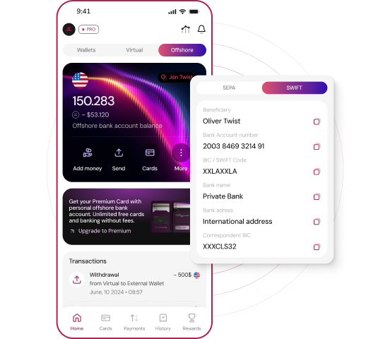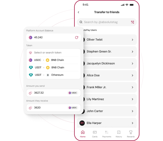 With AbsolutePay Bank Accounts, you can send any type of asset you hold to any bank account or wallet. Easily transfer funds quickly between your accounts or to other AbsolutePay users. From your bank accounts, you can also send funds to external bank accounts and wallets. Everything is simple, fast, secure, and private, giving you complete control over your financial operations.