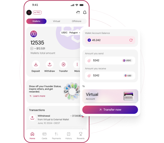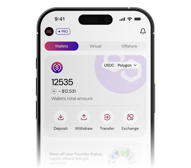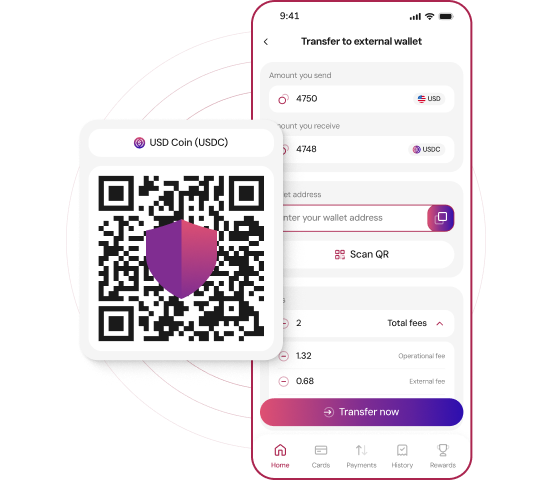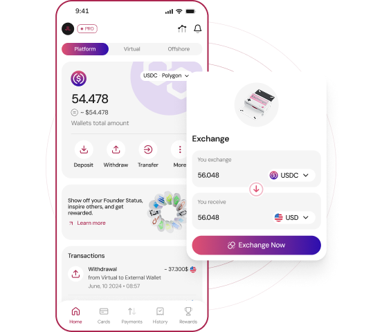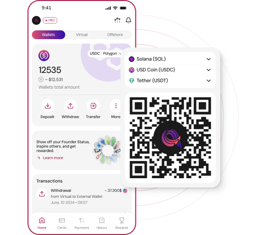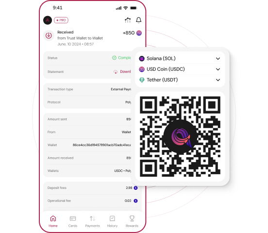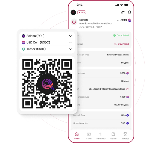 You can deposit cryptocurrencies from various blockchains, both from external wallets and exchanges, allowing you to integrate them into the global financial system and use them like fiat currency. Deposits can be made automatically in crypto, including from fiat and other accounts you own, as the exchange between fiat and crypto is done automatically.